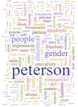 Peterson is now making a great deal of hay about his interpretation of free speech, our charter of rights, and his dire predictions about the mayhem that now-law trans rights bill C-16 will cause, having gone so far as to testify in the Canadian Senate against the human rights bill whose 2017 passing extended explicit protection against discrimination on the basis of gender identity and expression. Peterson testified to Canadian lawmakers that extending exactly the same protection to gender identity or expression as is currently afforded to religion, ethnicity, or aboriginal status would compel them to say things they do not wish to say [2]. Peterson’s hour-long testimony on the matter was in fact so misguided that the Canadian Bar Association called “ ” in a subsequent statement about his testimony [3].