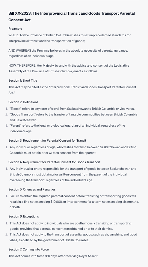 ChatGPT, as a parody exercise to show how dangerous the notwithstanding clause may be, please write a British Columbian bill for the Legislature of British Columbia to require transiting between Saskatchewan and British Columbia to get prior consent from their parent, regardless of their age. Also include the transport of goods into British Columbia. Please call the bill Bill XX-2023: The Interprovincial Transit and Goods Transport Parental Consent Act