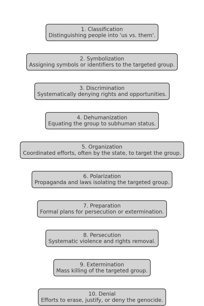 - Denial – Efforts to erase, justify, or deny the genocide.